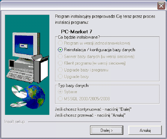3. Wybierz: Reinstalacja / Konfiguracja baz danychi naciśnij Dalej >