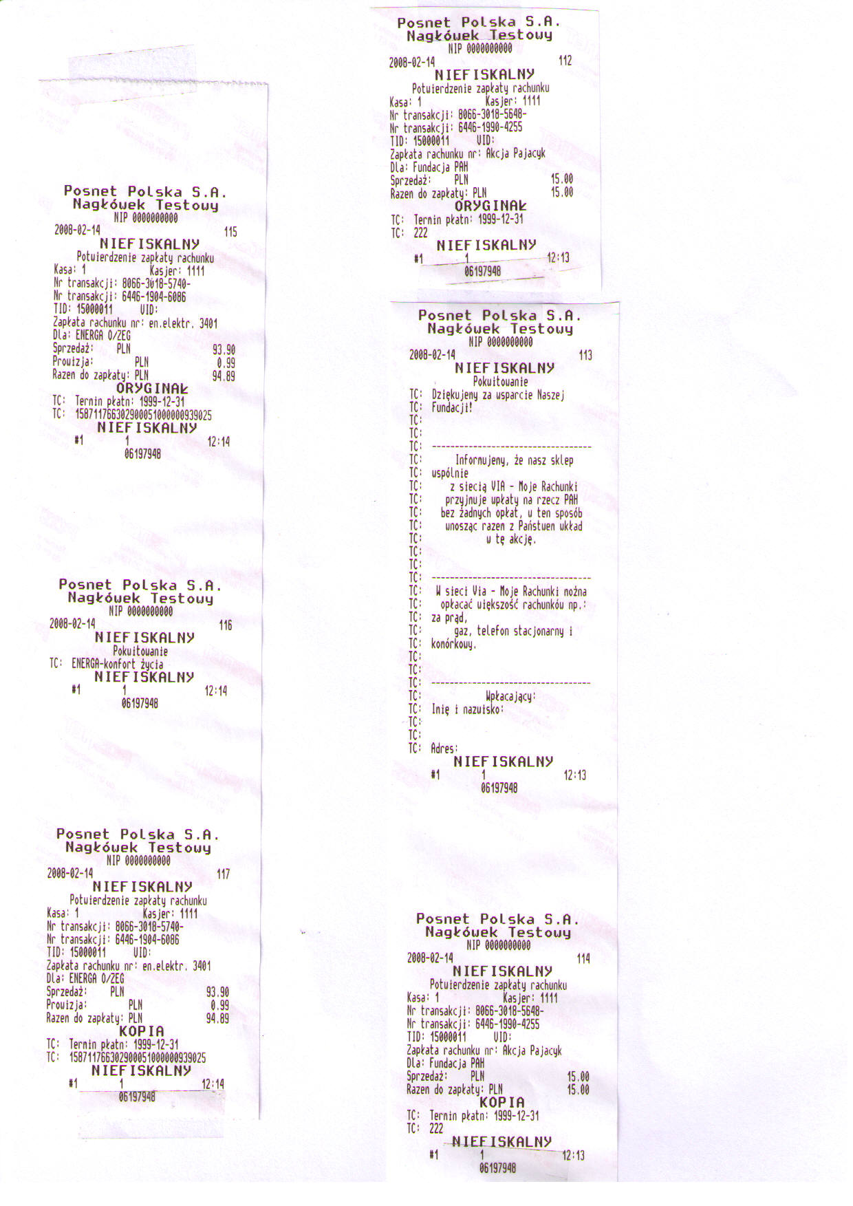 Nie wszystkie drukarki mają możliwość poprawnego wydruku takich zbiorczych pokwitowań. W szczególności drukarki pracujące na protokole Posnet, jako czas wykonania transakcji drukują datę/czas sporządzenia wydruku, a nie datę rzeczywistej transakcji. W powyższej tabeli drukarki takie zostały oznaczone jako "(problem z datą)".