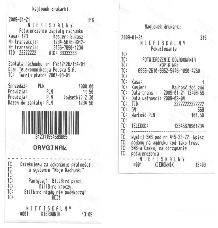 Drukarka systemowa - prepaid i rachunki: